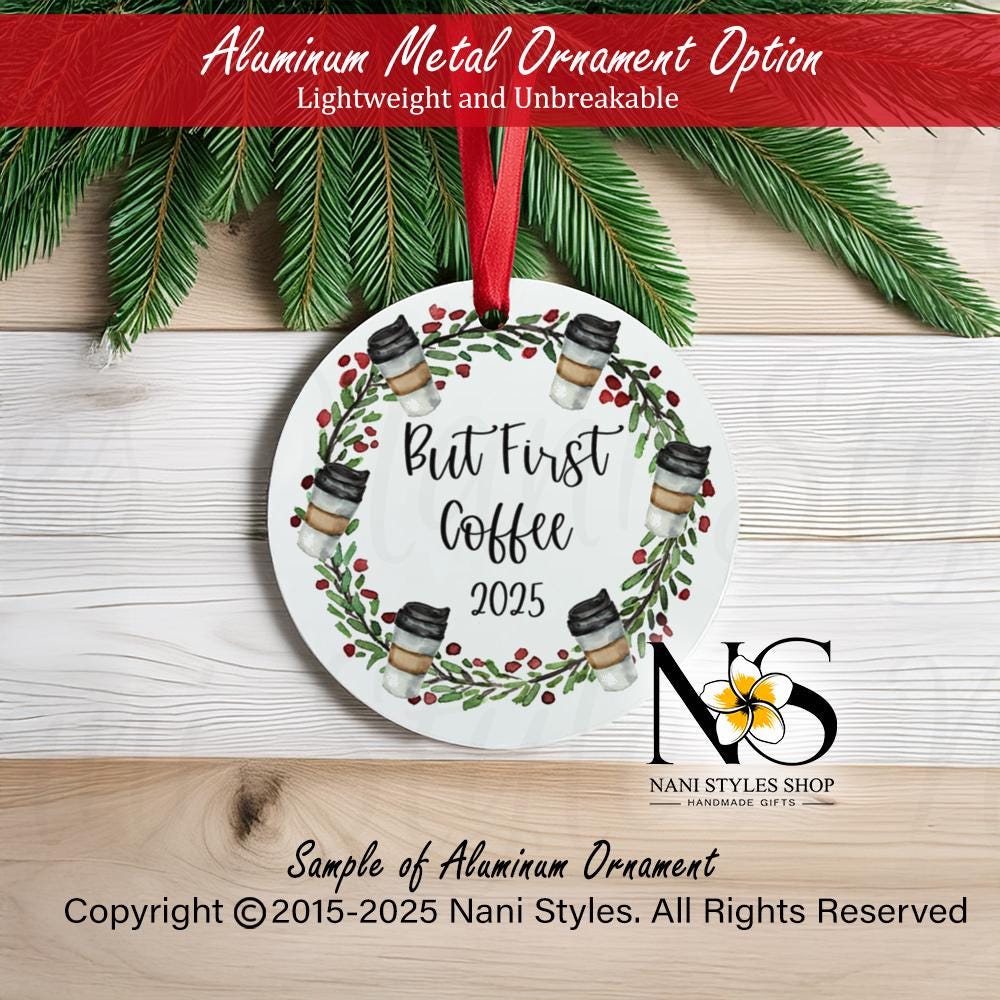 Personalized Coffee Lover's Ornament – A Caffeinated Celebration. Choose from Porcelain Ornament or Aluminum Ornament. Aluminum is great for those with pets or small children as it will not break.