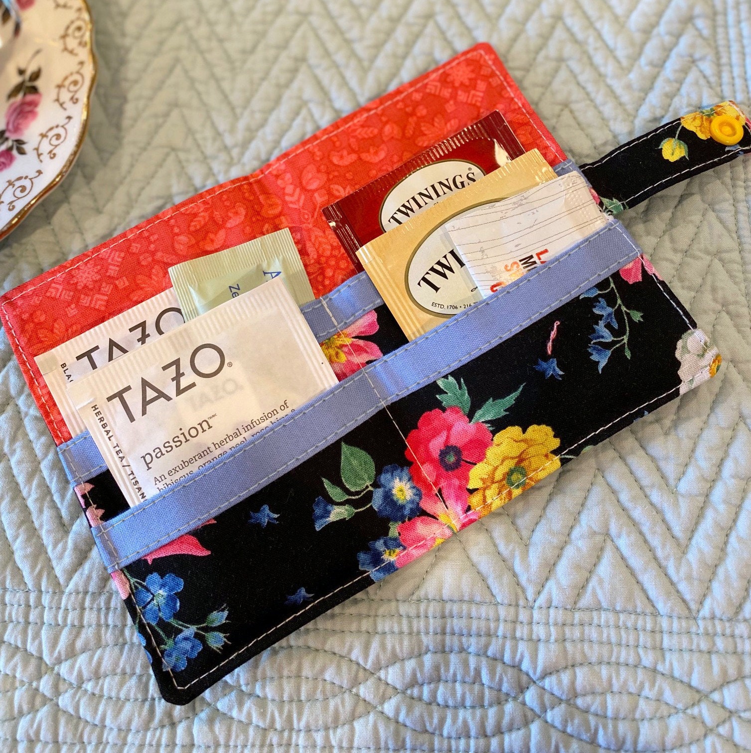 The Tea Wallet is made from high-quality 100% Cotton quilting fabric. The wallet is designed with multiple pockets to hold individual tea bags and sweetener packets. The coordinating snap is made from durable plastic that ensures the wallet stays closed and secure.