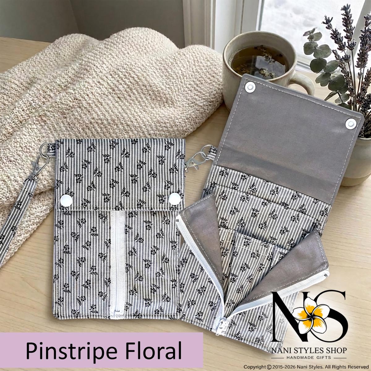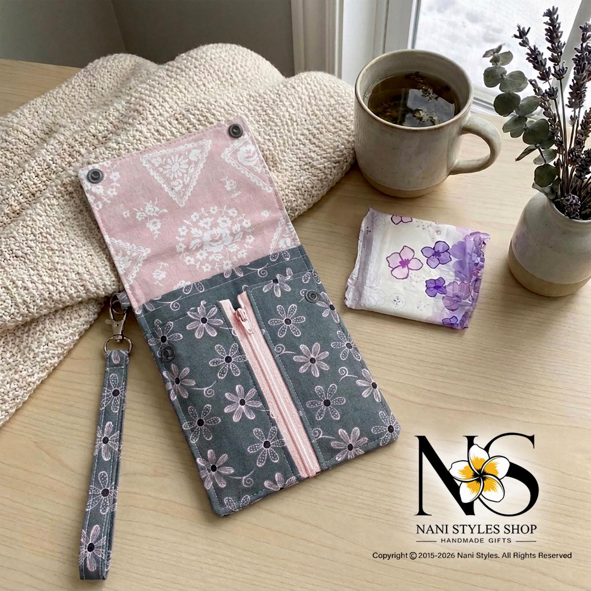 The pouch zips and snaps closed to keep everything inside neatly. This ensures that your sanitary supplies remain secure and don't fall out. You can easily hang it on a hook in a bathroom stall using the wristlet, making it perfect for travel, school, work, and more. The wristlet is also perfect for those who prefer to carry their sanitary supplies on their wrist, as it allows for easy access.
