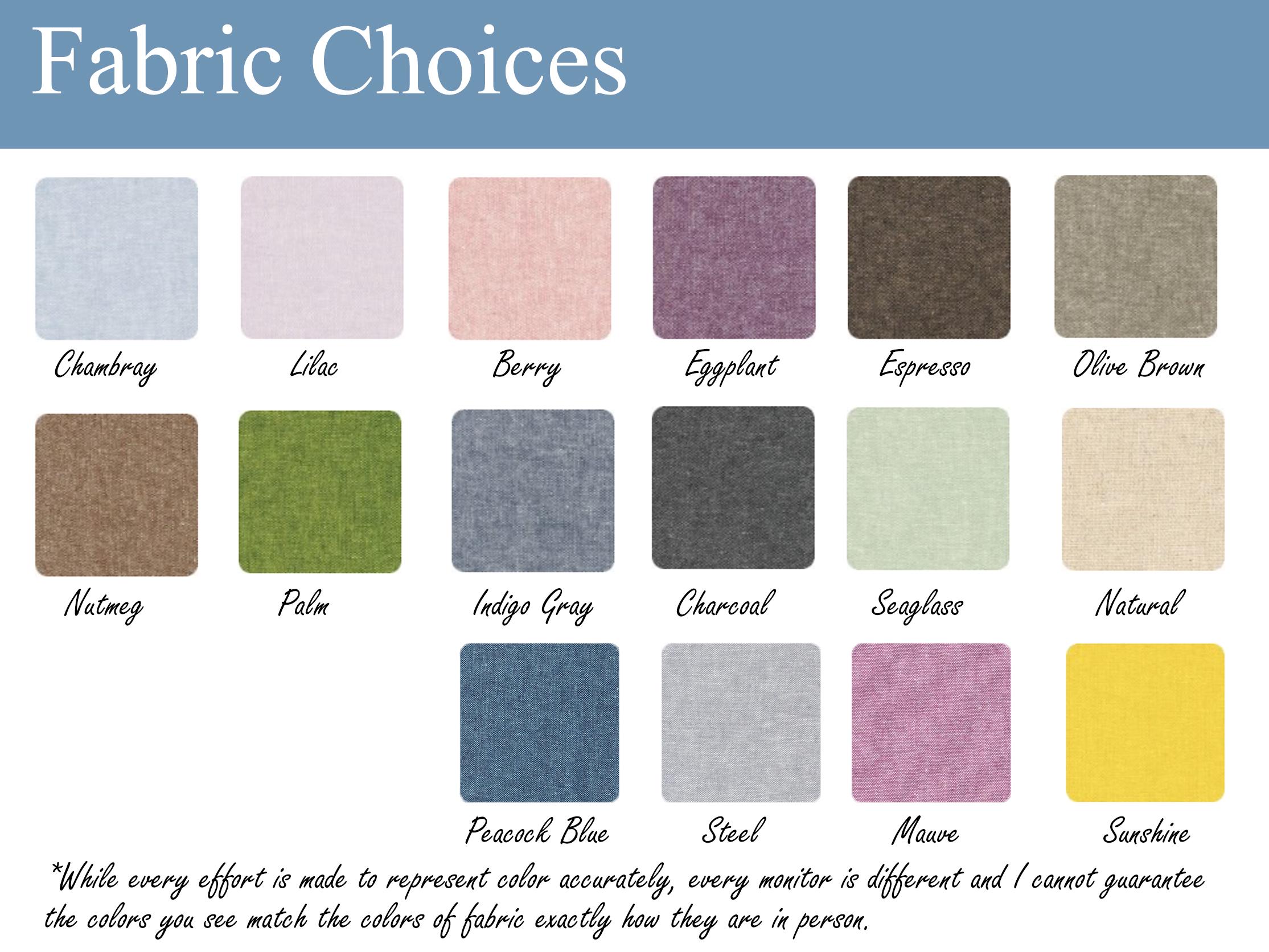 Please note that colors may vary slightly due to monitor settings and that lengths may vary by about 1/2".