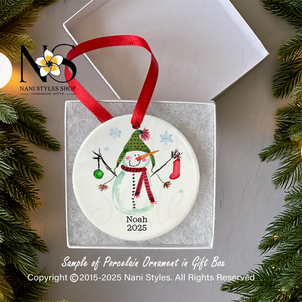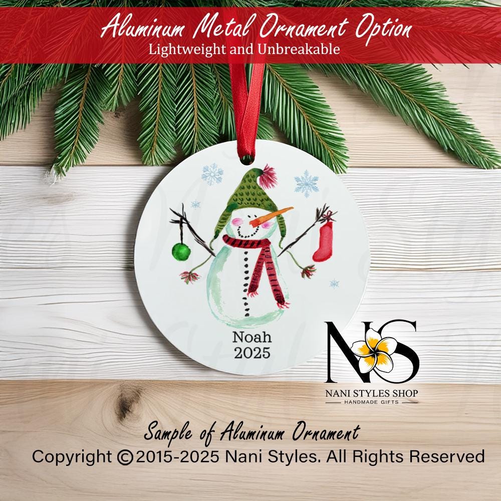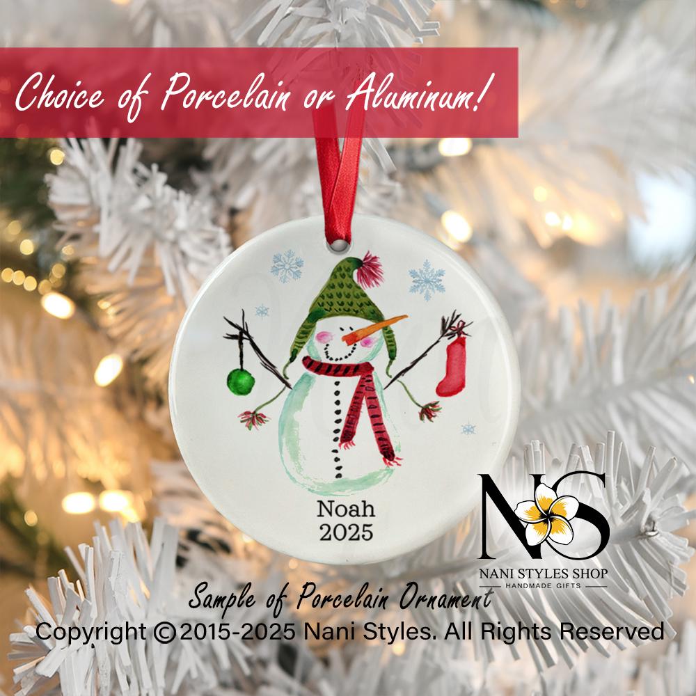 Personalized Watercolor Snowman Ornament. Add a Touch of Whimsy to Your Holiday Decor! Choose from Porcelain Ornament or Aluminum Ornament. Aluminum is great for those with pets or small children as it will not break.