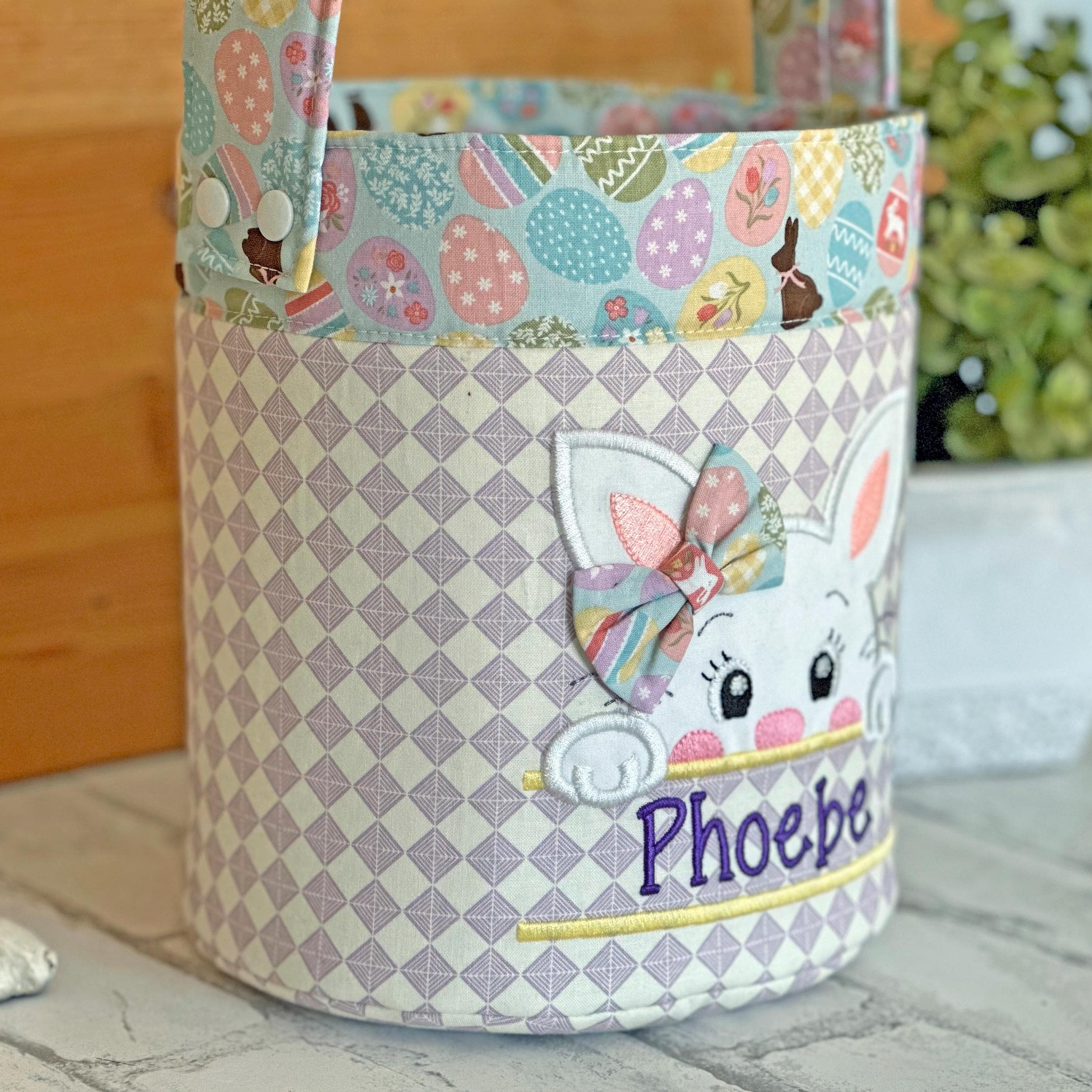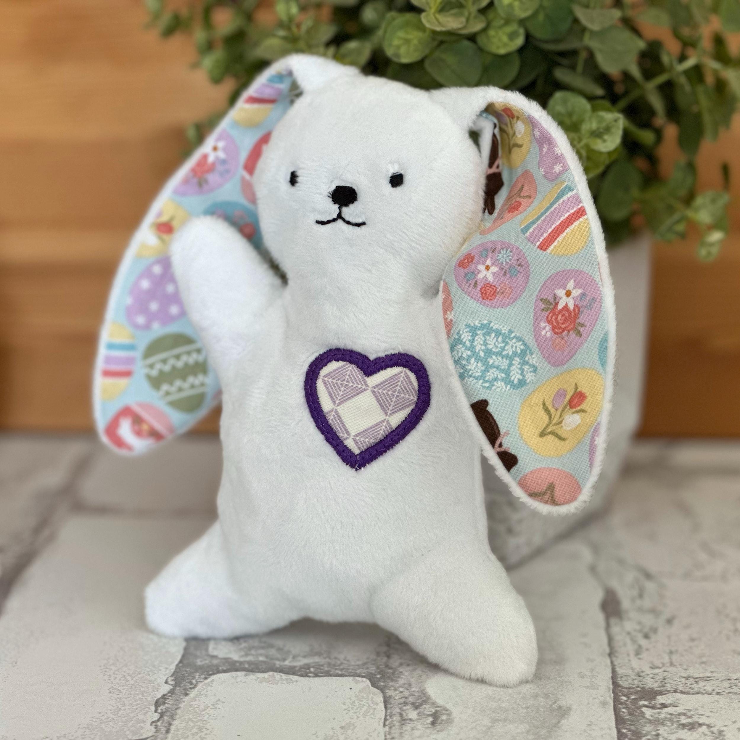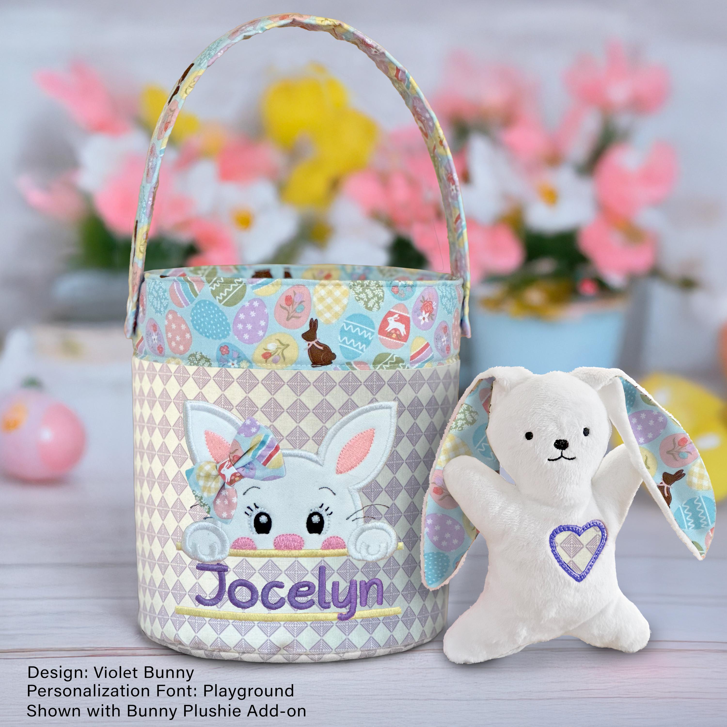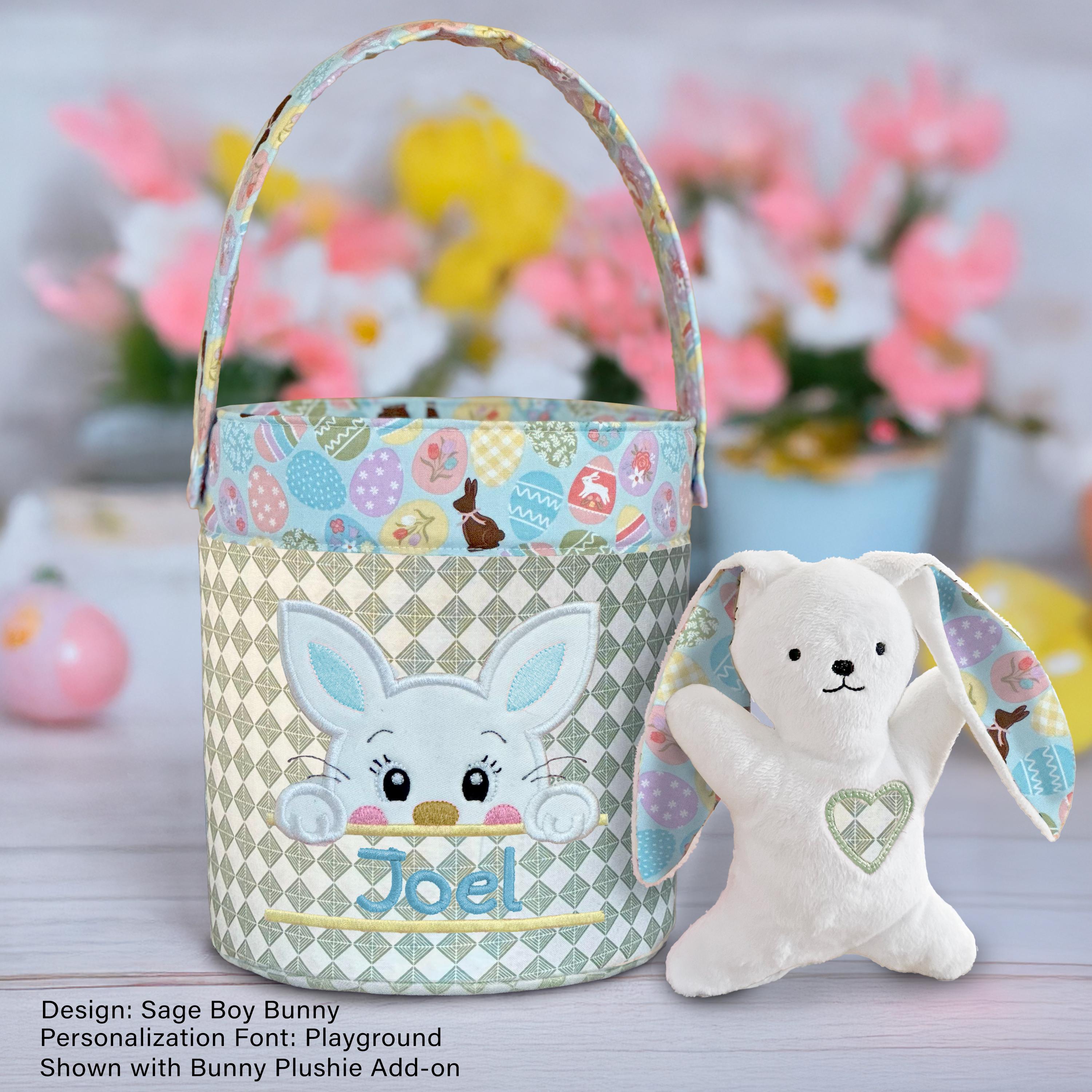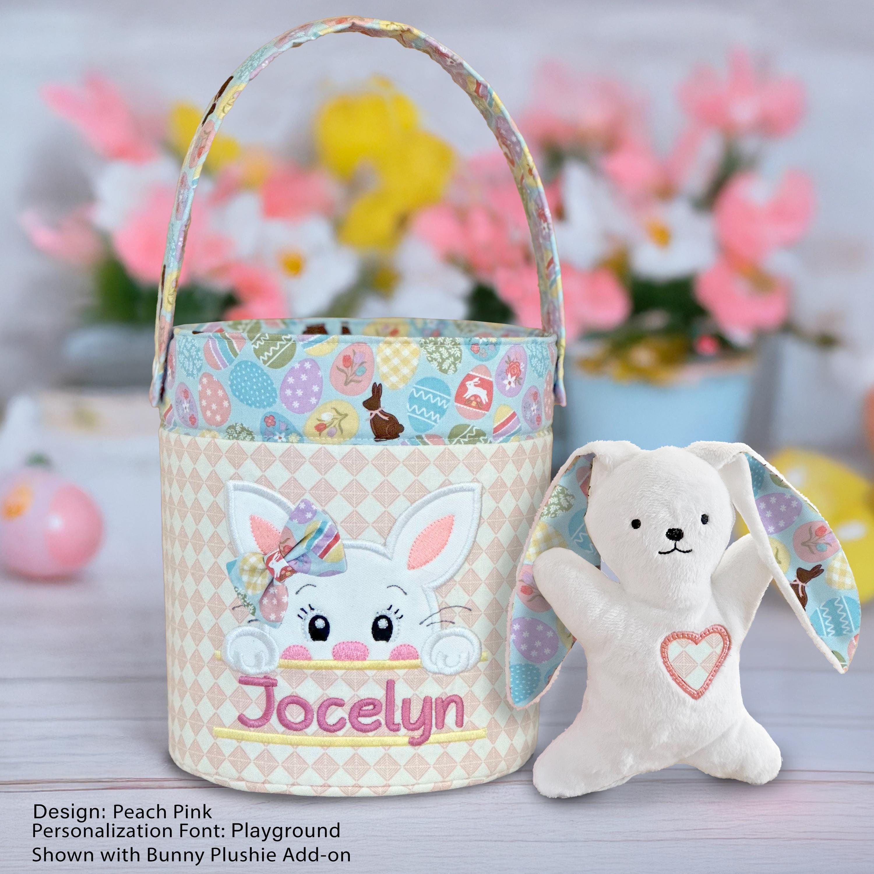 Complete the look with a handmade bunny plushie, available as a separate add-on through a different listing. Each bunny is custom made to coordinate perfectly with your basket, using soft minky fabric, with the ears and sweet heart detail crafted from the same fabrics as your basket.