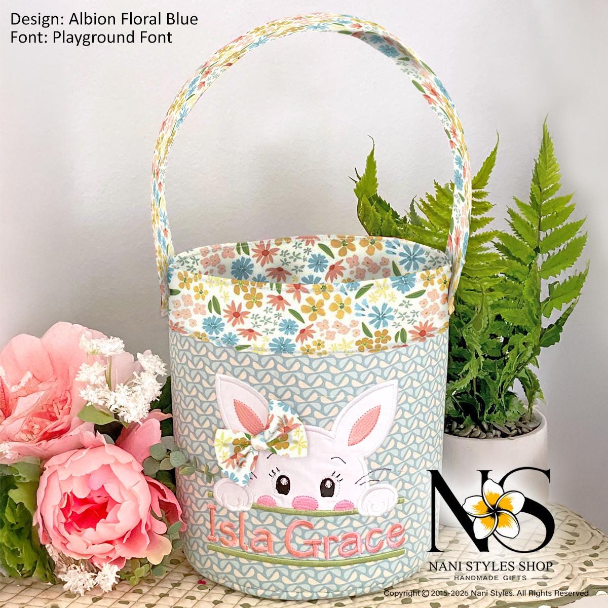 Please note that all my baskets are made to order. If you desire a different color combination, applique, or embroidery design, simply send me a message. I also welcome the option for you to provide your own fabrics.